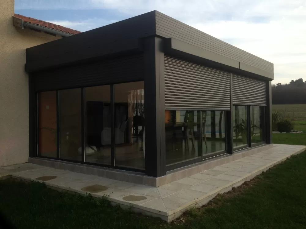- Véranda avec volet roulant motorisé : Plus de confort avec un volet roulant électrique, facilement contrôlable à distance.